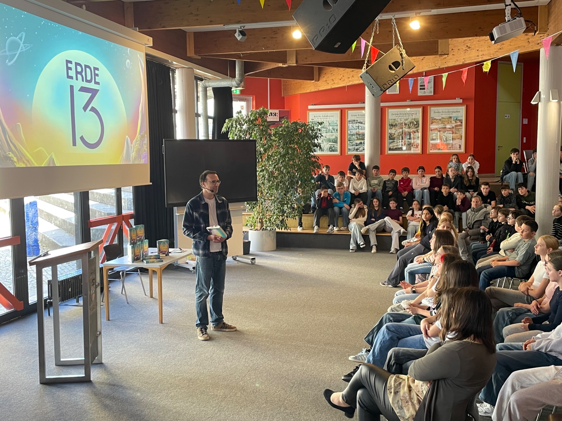 Zum heutigen Welttag des Buches (23.4.26) durften sich die 6. Klässler der ARR über ein besonderes Geschenk freuen: Eine Autorenlesung des Autors Andreas Langer, der seinen spannenden Abenteuerroman „Erde 13 – Aufbruch ins Ungewisse“ vorstellte und neben einigen Textpassagen auch viel Hintergrundwissen zur Entstehung preisgab. Frau Gerblinger von der nahegelegenen Buchhandlung hatte die Lesung bei einem Gewinnspiel zum Welttag des Buches gewonnen und den Schülerinnen und Schülern der Realschule geschenkt. Im Anschluss durften die Kinder dem Autoren noch etliche Fragen stellen, die ihnen unter den Nägeln brannten. Auch die anschließende Signierstunde durfte dabei natürlich nicht fehlen. Herzlichen Dank an Herrn Langer und Frau Gerblinger für diesen tollen Vormittag! BB